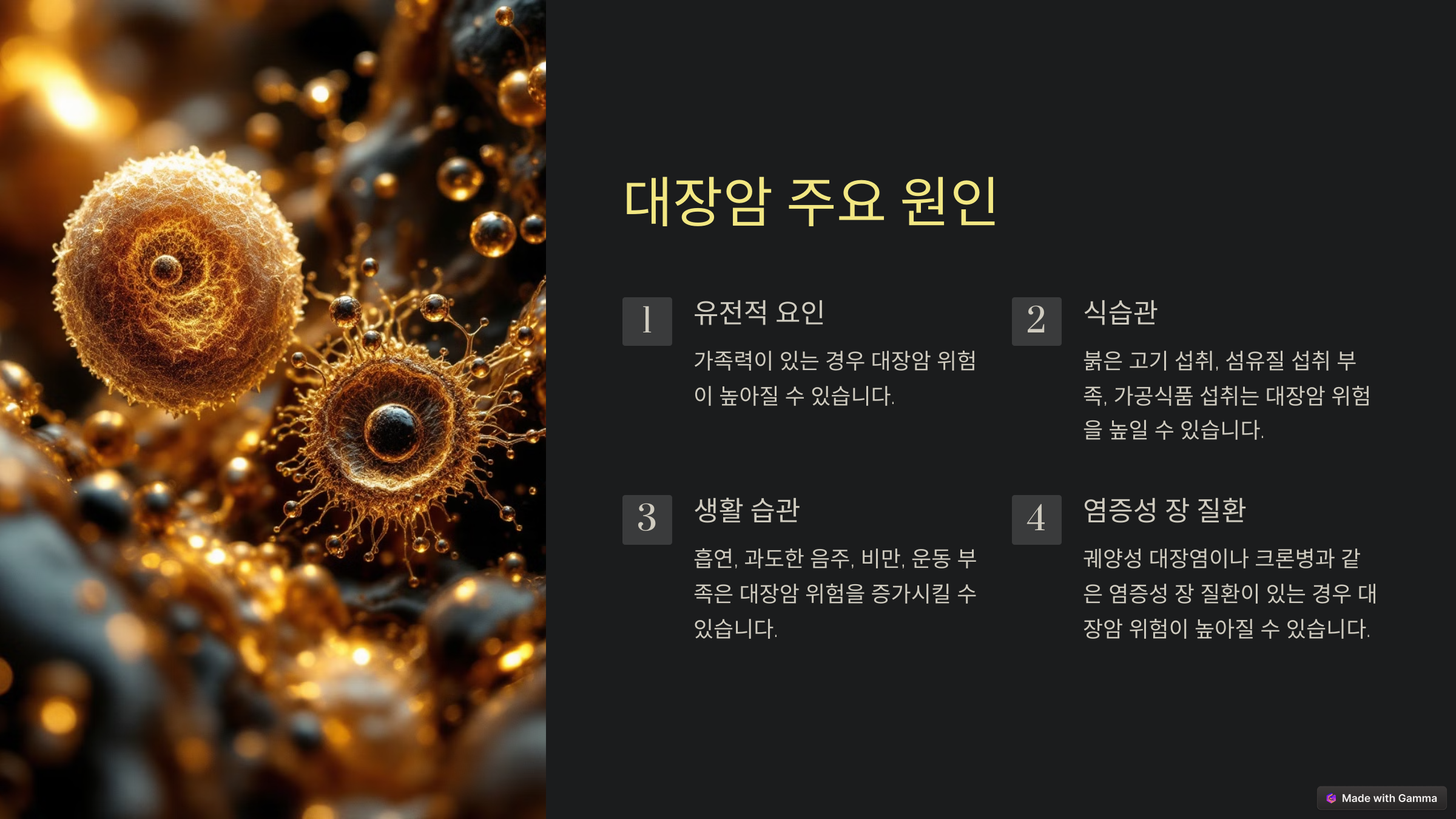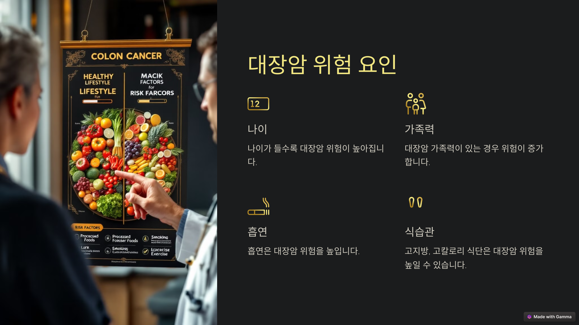 이 외에도 고령, 비만, 염증성 장질환(크론병, 궤양성 대장염) 같은 요인들이 대장암 위험을 높일 수 있어요. 자신의 건강 상태를 잘 알고 적절한 관리를 통해 위험을 줄이는 것이 중요하답니다.