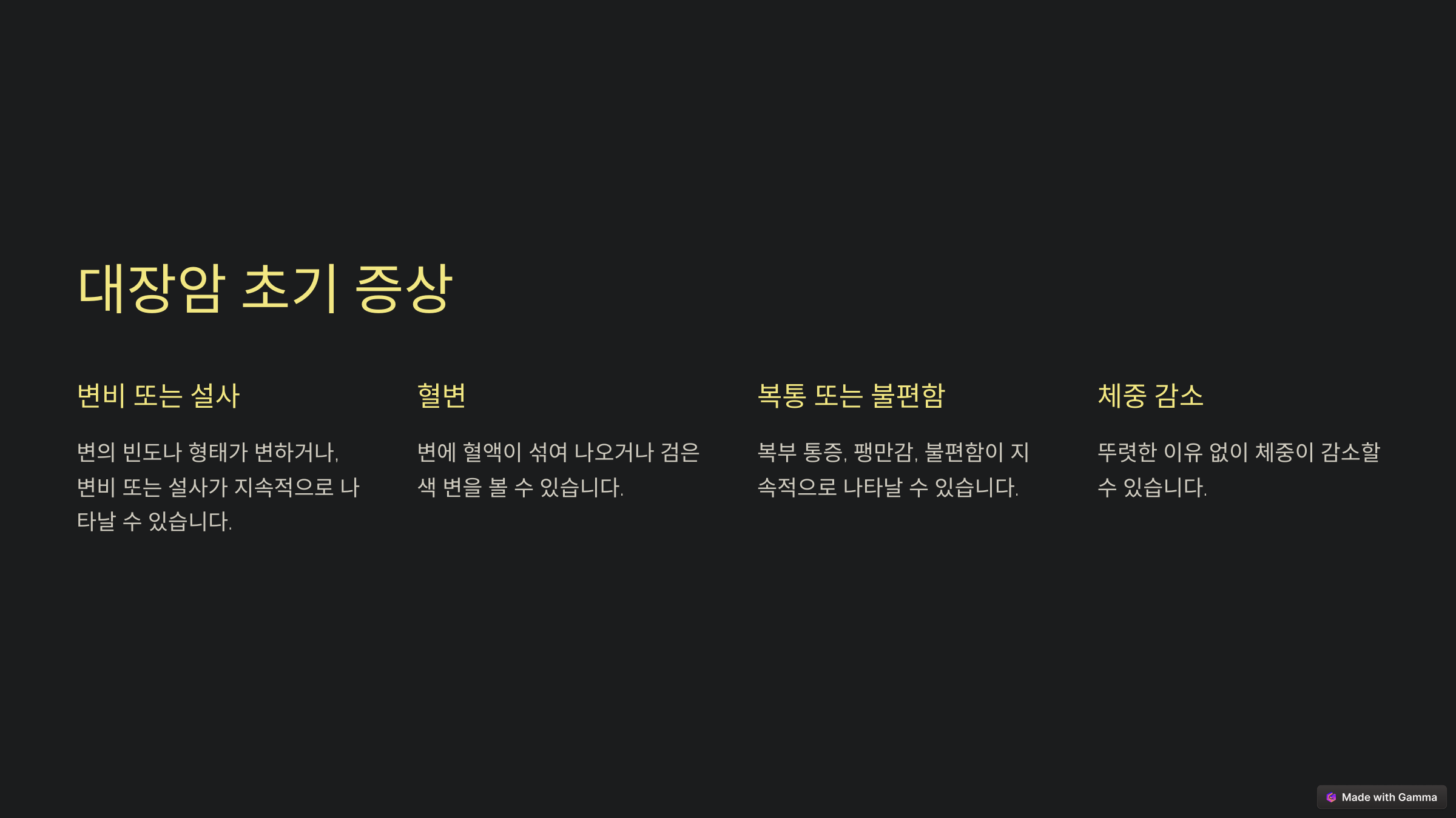 A5. 배변 습관 변화, 혈변, 복부 불편감, 갑작스러운 체중 감소 등이 주요 초기증상이니 꼭 주의 깊게 살펴보세요.